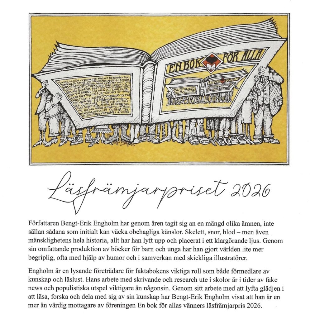 Bengt-Erik Engholm får En bok för allas vänners läsfrämjarpris 2026 eftersom han är ”en lysande företrädare för faktabokens viktiga roll som både förmedlare av kunskap och läslust”.