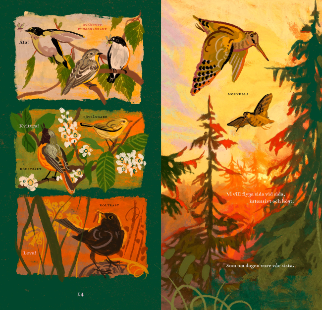 Att slå upp den här långsmala boken är att kliva rakt in i fåglarnas värld. De olika avsnitten I skogen, Kring fälten, Vid vassen samt Bland löv och barr inleds med några sidor där fåglarna har ordet. ”På nattkvist hjälps vi åt att hålla värmen”, berättar stjärtmesarna som sitter hopkurade på en kvist medan berguven spanar från ovan. På ett annat uppslag flaxar morkullorna högt bland grantopparna mot en brandgul skymning: ”Vi vill flyga sida vid sida, intensivt och högt. Som om dagen vore vår sista.”