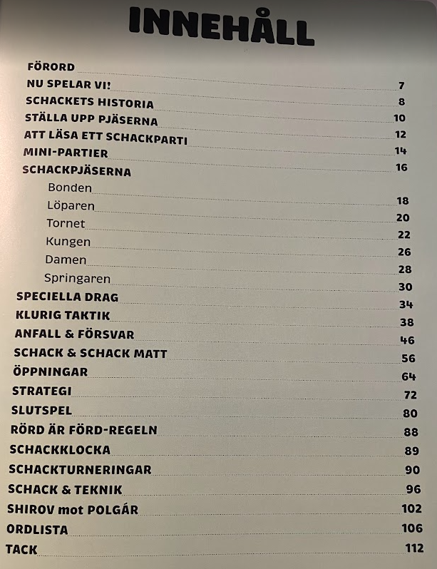 Boksidorna är fulla med färgglada bilder av pjäser och spelbord och med pilar och förklaringar. Här måste man läsa i lugn och ro, kolla in bilderna, läsa texten och fundera. Massor med taktik är det, men också en del som är intressant att läsa om schackvärlden. Boken innehåller många schacktermer som förstås förklaras. Jag uppfattar inte språket som svårt men faktaspäckat, så läsaren måste ta det lugnt och tänka. Och det passar väl kanske bra för blivande schackspelare.